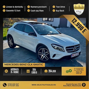 Mercedes Benz GLA200 4Matic - Sport - Panoramic Motorizare - 2.2 Diesel 136cp Fabricatie 11.2014 Euro 6 Cutie Automată 7g-tronic Rulaj 204.xxx km PREȚ PROMOȚIONAL 12990 - plata se face in lei la curs BT Se emite factura fiscală Garantie motor+cutie viteze Posibilitate plata cash sau rate - ...
