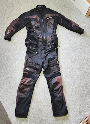 Costum moto textil format din 3 piese integrate: geacă, mesadă și pantaloni touring. Marca Buse, mărime mare (eticheta spune D 58 UK 48). Am 1,90 m, 90 de kile și stă pe mine cum vedeți în fotografii, cu ajustările strânse la maxim pe talie. Ajustată corespunzător, s-ar potrivi și pe un uriaș (rotund ...
